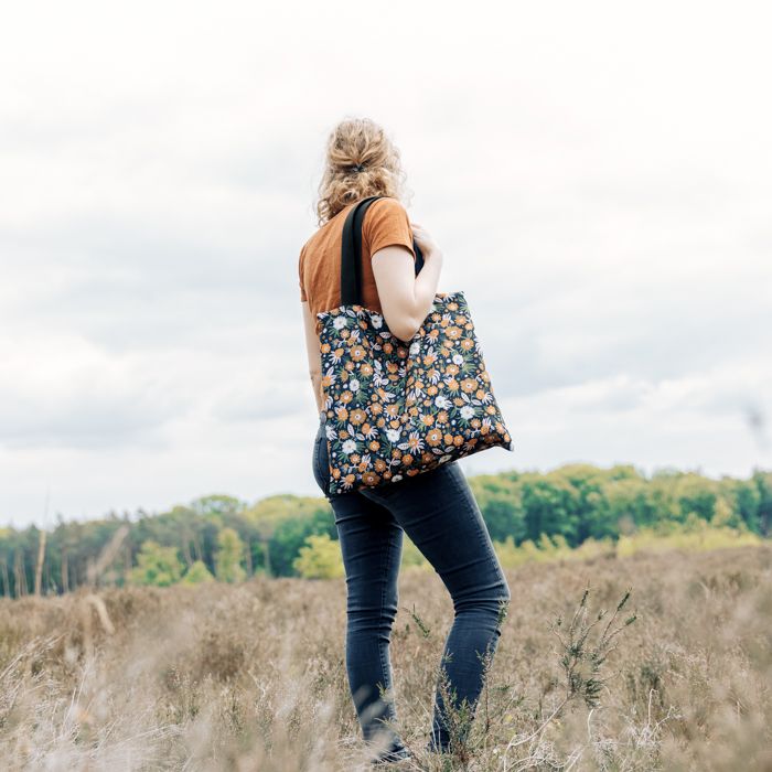 De tas is bruikbaar als schoudertas en als handtas, omdat we de tas afwerken met een katoenen hengsel van 4 cm breed en 78 cm lang. Kies uit een zwarte of een witte band, met bijpassende kleur garen voor de juiste look.